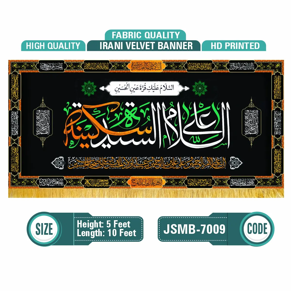 Beautiful Irani HD printed Velvet Banner for Majalis, Drawing rooms, TV launch etc. Design Related Bibi Sakina s.a [Available Sizes: 2.5X5 & 5X10 feet] Perfect for Ashra e Majalis Moharram ul Haram