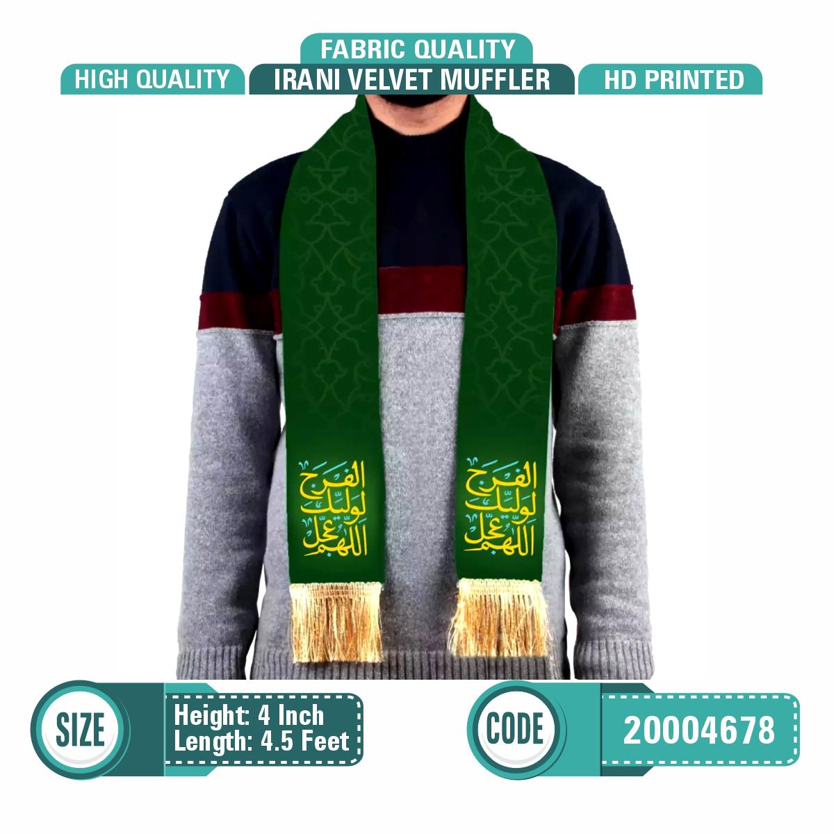 HD Printed, Velvet Muffler for momineen. Beautiful Calligraphy اَللّهُمَّ عَجِّل لِوَلیِّکَ الفَرَج Size: 4" x 4'.5" inches Best for Azadari & Meeladh ceremonies. Imported by Iran